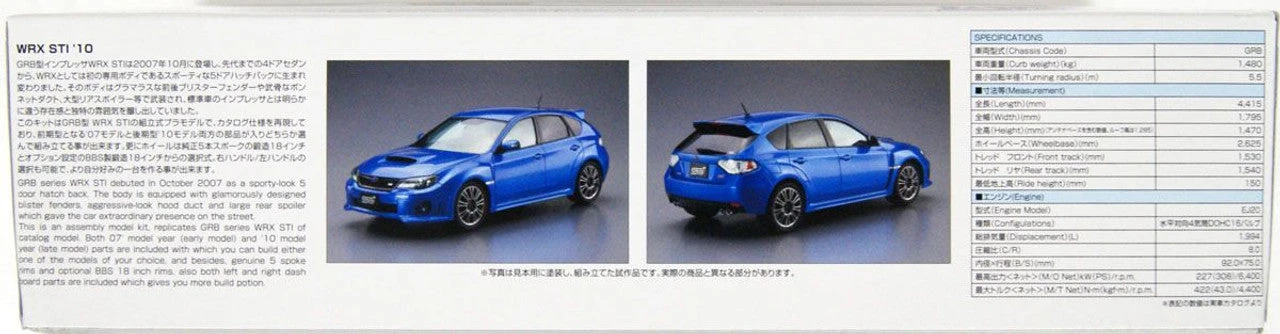 This is an assembly model kit, replicates GRB series WRX STI of catalog model. Both 07′ model year (early model) and ’10 model year (late model) parts are included with which you can build either one of the models of your choice.