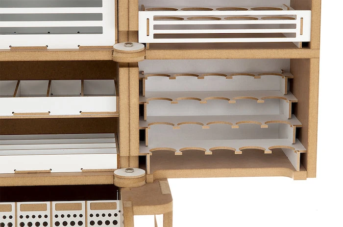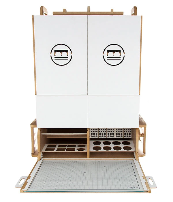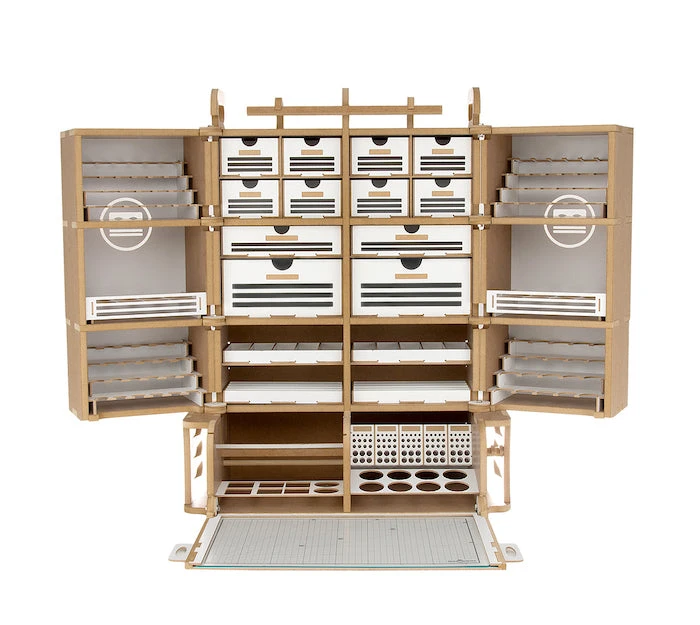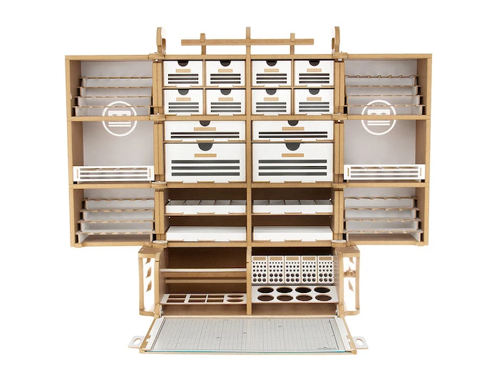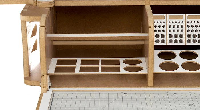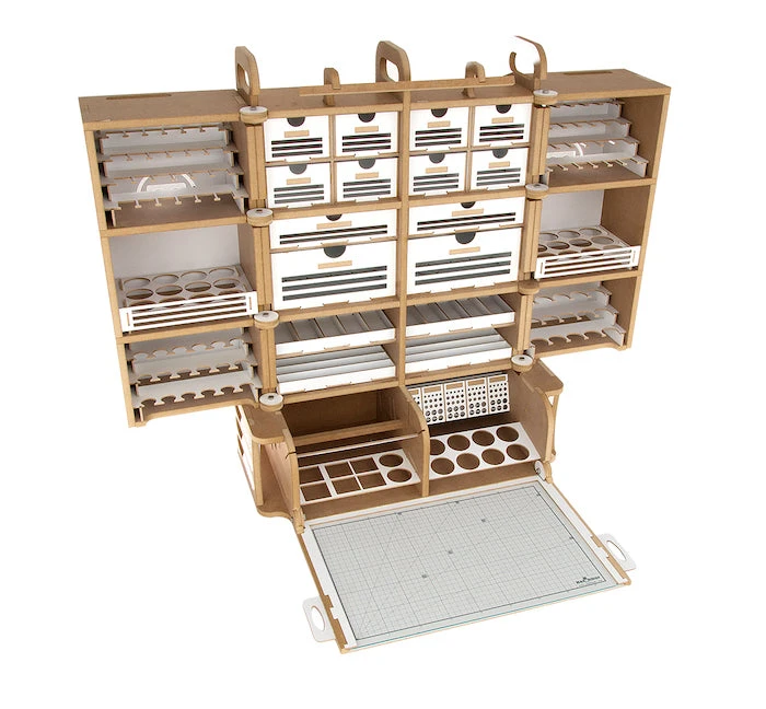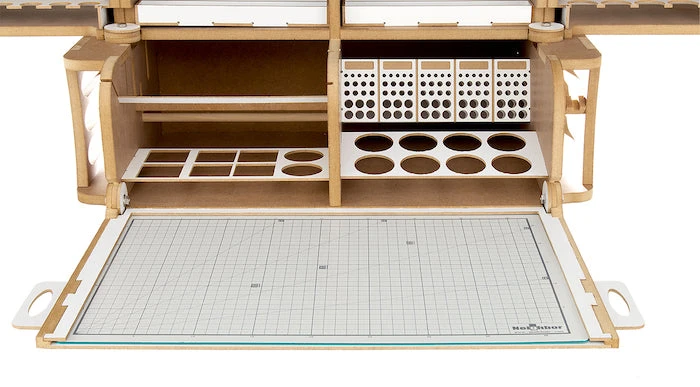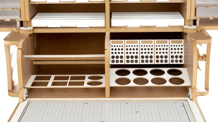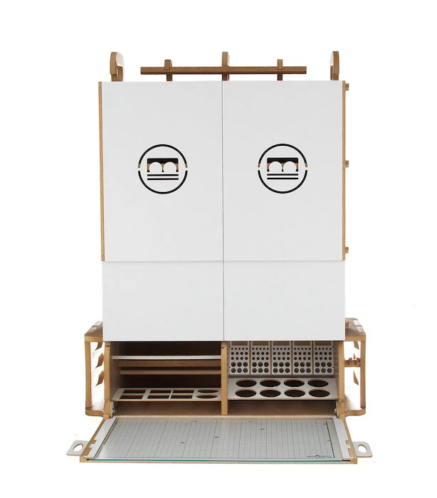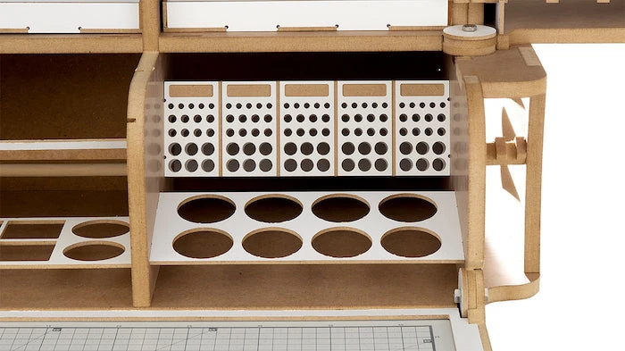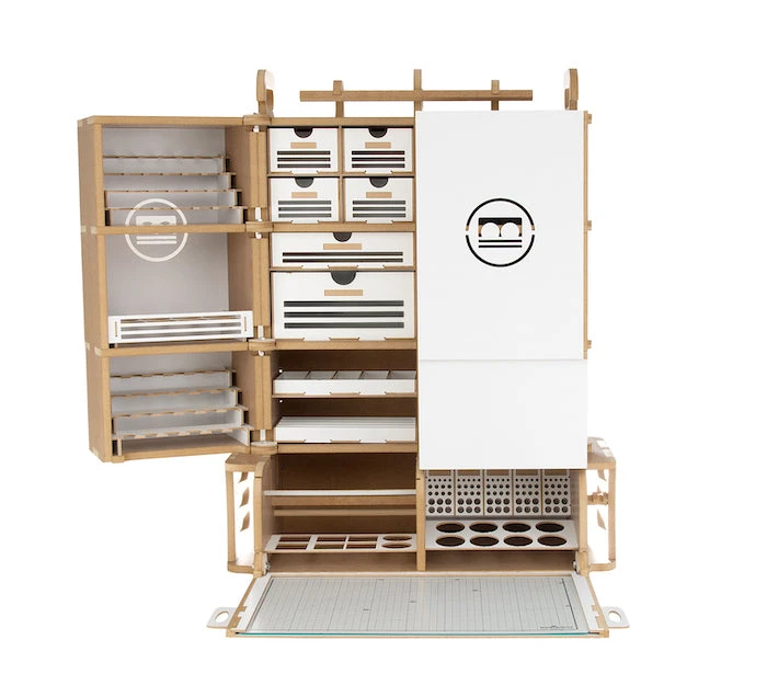 This product is gated and portable workbench and workstation used to manufacture Hobby-Modeling-Kit and Gundam-Kit. and can store a cutting mat of A3 size and storage a large amount of paint. This contains many necessary functions for the hobby modelling, such as Nipper/Tweezer Holder, Brush/Tool Holder, various sizes of drawers. You can add a spraybooth.An opening and closing method that opens and closes perfectlyThe handle on the top allows you to move your workspaceThorough interior protection from the external environmentA work space where cutting mats are stored and opened/closed togetherA storage compartment with a total of 16 rows for paintA large brush/tool holding space of a total of 5 sectorsAmple storage space consisting of 2 extra-large drawer / 2 large drawers / 8 medium-sized drawersA toning pate holder that can be used as a palletAn exclusive storage space where you can store various modeling productsA snipper/tweezer hanger, which is essential for model productionA multi-purpose tool tray that can be conveniently usedA stand to which you can attach LED lights or the manualStorage space for a maximum of 24 clear toning bottlesGuarantees strong durability with the use of incredibly thick and sturdy wood of 12mm