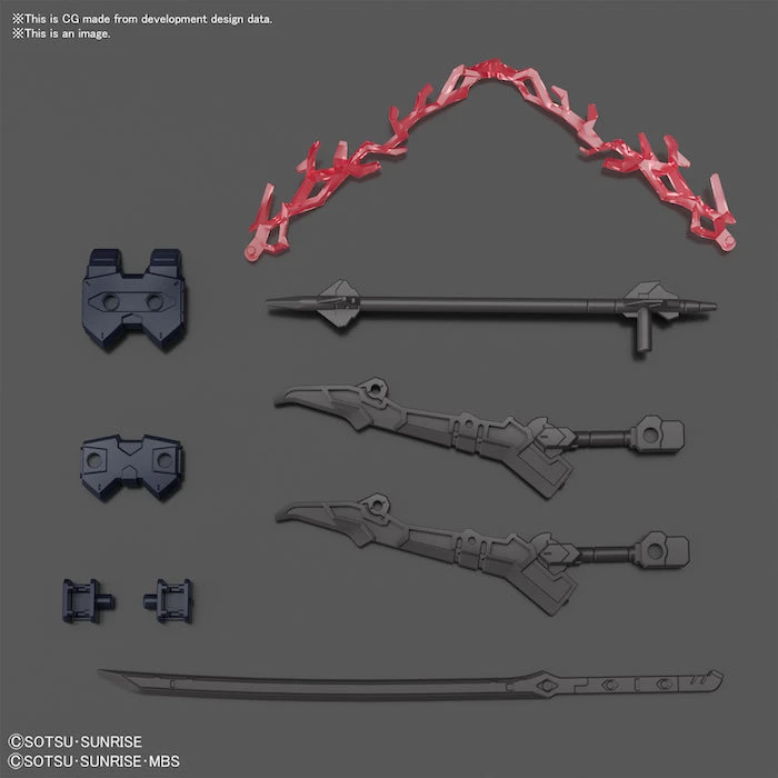 Twin blades are transformed into hand gun mode. Furthermore, it can be combined and reassembled into a large bow using clear parts, and the pose of pulling the attached bow and arrow is also possible.