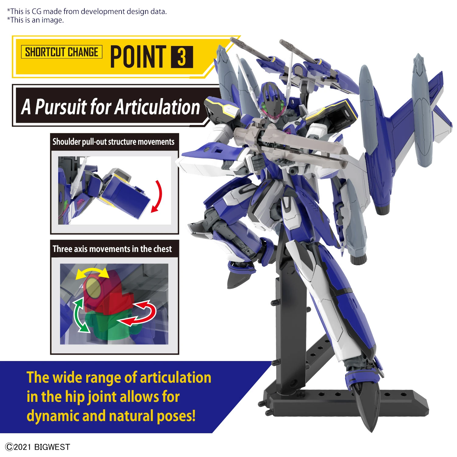 The booster nozzle has a telescopic gimmick; the curved beauty of the forward wings in Fighter Mode are faithfully reproduce, as is the characteristic silhouette in Gerwalk Mode. The Battroid Mode also boasts its typical smart bodyline! The range of motion of the arms has been expanded by giving the shoulders pull-out joints, and a triple-axis joint has been added to the chest too. Its hip joint also has a wide range of motion for dynamic and natural posing. The clear parts are made with polarization molding in three colors that change depending on how the light hits it, too!