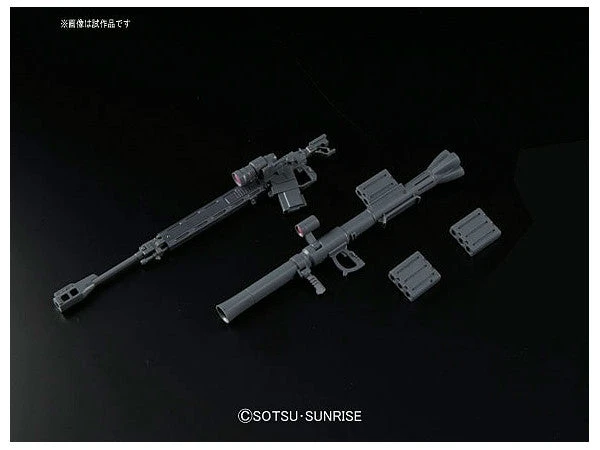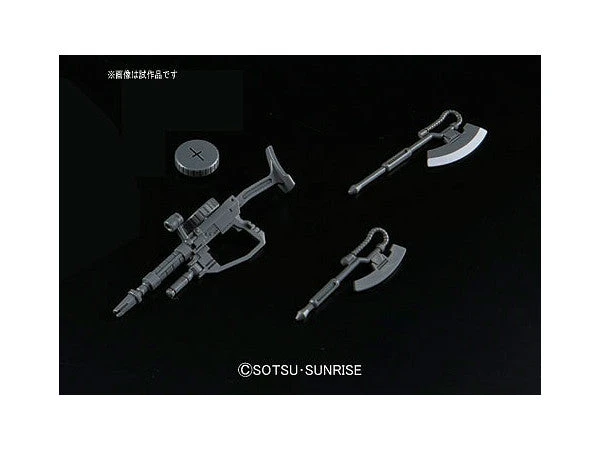 From “Gundam Origin” comes this High Grade Zaku I which can be built as either Denim’s unit or Slender’s unit. Slender’s unit sports the standard Zaku shield but Denim’s shoulder lacks the shield and different parts are provided. Weapons inlcude the Rifle, Bazooka, Machine Gun, and Heat Hawks. All parts come molded in multiple colors with stickers included to add color and markings.