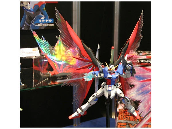 The much-anticipated MG kit of Destiny Gundam is here, and is definitely not one to disappoint! The joints on this sharply detailed MG kit are greatly improved to allow for a wider range of movement and are more capable of replicating action poses as seen in the show. The wings can open and close, and it comes complete with its signature weaponry along with in-scale unpainted figures of Shinn Asuka (sitting and standing) and Stella Loussier. Foil stickers and original design marking stickers are included for custom markings, plus a custom display stand to assist with dynamic action poses. This special Extreme Burst Mode set also includes beautiful wing effect parts, clear beam effect parts, and a metallic gray runner of some mechanical parts including hands, plus 1/20-scale clear figures of Shinn Asuka and Kira Yamato.
