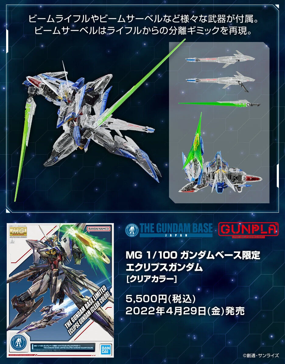 ![Bandai MG The Gundam Base Limited Eclipse Gundam [Clear Color] 1/100 3 Bandai MG The Gundam Base Limited Eclipse Gundam [Clear Color] 1/100 - Image 3](https://www.pandahobbyshop.com/wp-content/uploads/2025/12/MGTheGundamBaseLimitedEclipseGundam_ClearColor_1_100-4.webp)