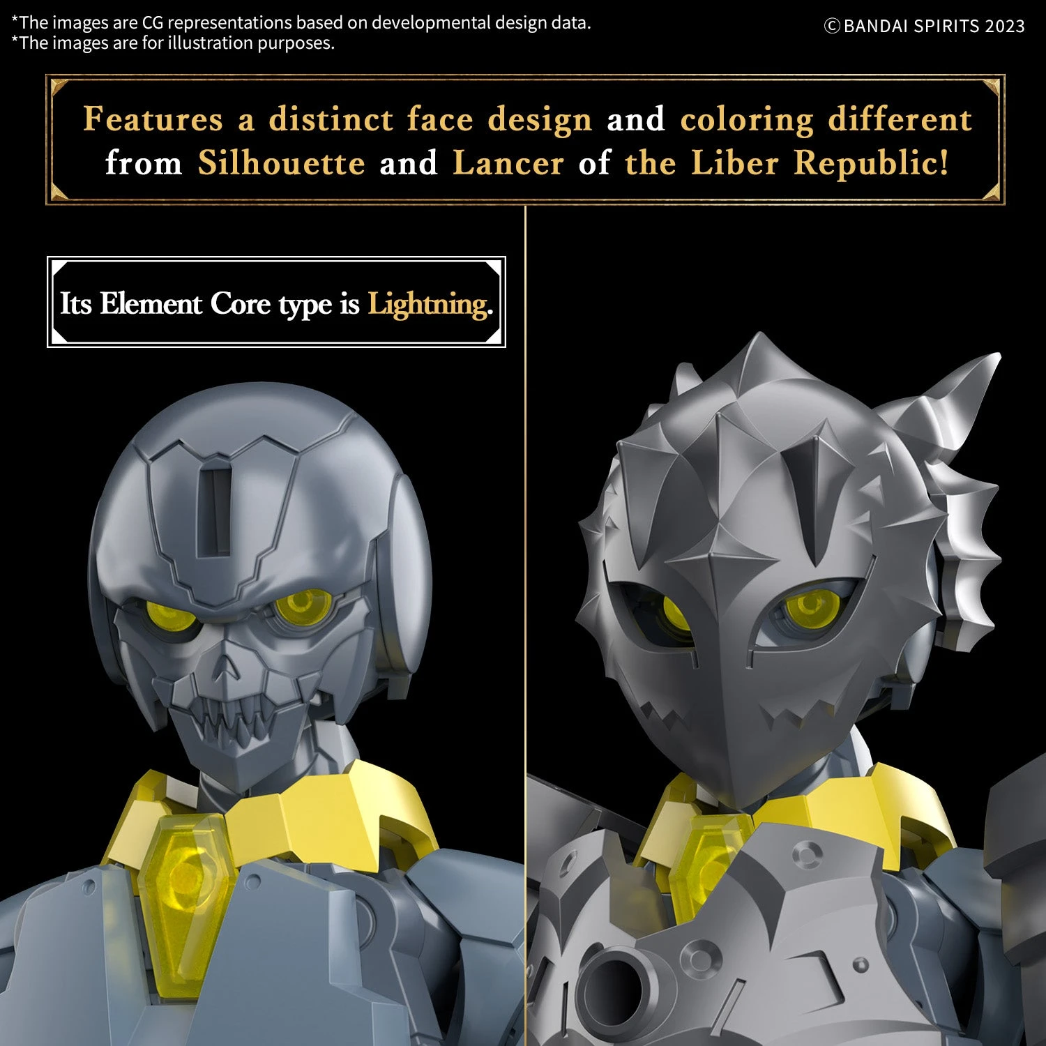 Armaments include a “lance” and a “shield.” Flexible movement is achieved by using a mechanism to attach shoulder and waist armor via the joint on the back. The attribute of the “Element Core” is “lightning”. The face design and coloring are different from the Liber Republic’s “Silhouette” and “Lancer” (sold separately).