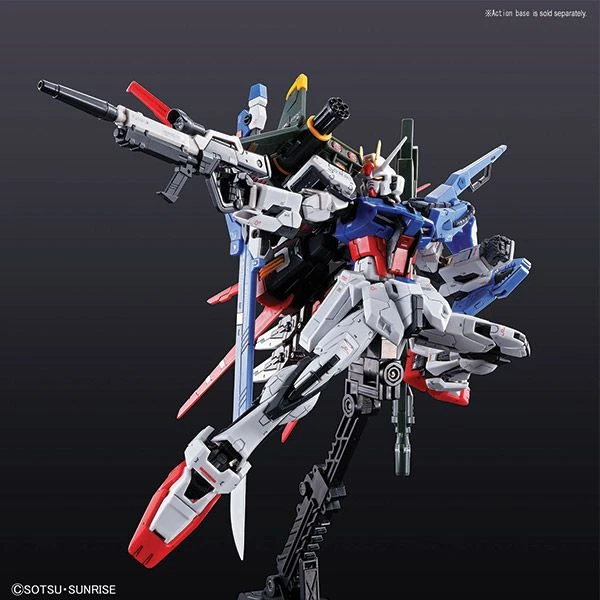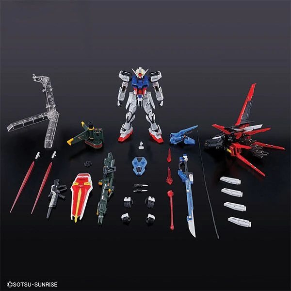 A Strike Gundam variant that utilizes the Aile Sword, and Launcher packs simultaneously for maximum firepower! To accommodate this configuration the RG Strike Gundam includes new parts to replicate the energy packs as well as a new joint mounts for the Schwert Gewehr Anti-Ship Sword and Agni Hyper Impulse Cannon and additional support parts to counter the heavy backpack. A clear display stand along with all previous Strike Gundam weapons including beam sabers, Armor Schneiders, beam rifle, and shield are also included. Realistic decal sticker sheet included.
