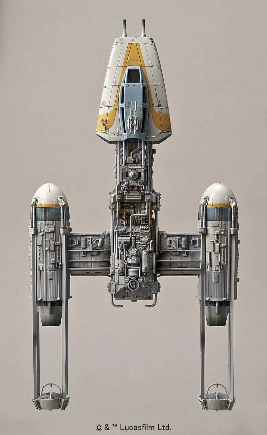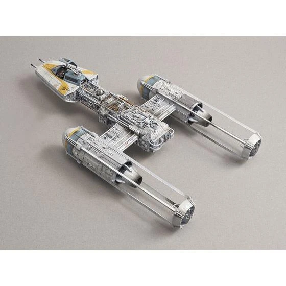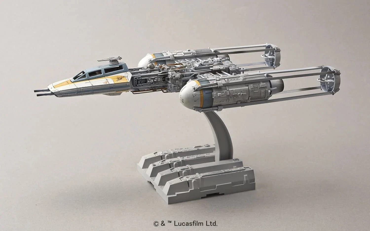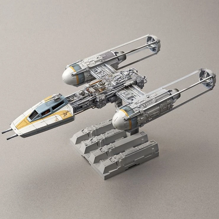 The Y-Wing Starfighter comes with two sitting pilots, one standing pilot, an R5 style Astromech Droid, and an R2 style Astromech Droid. The canopy of the ship can also open up. This model kit comes with some pre painted pieces, but additional paint will need to be applied for weathering affect and other details.