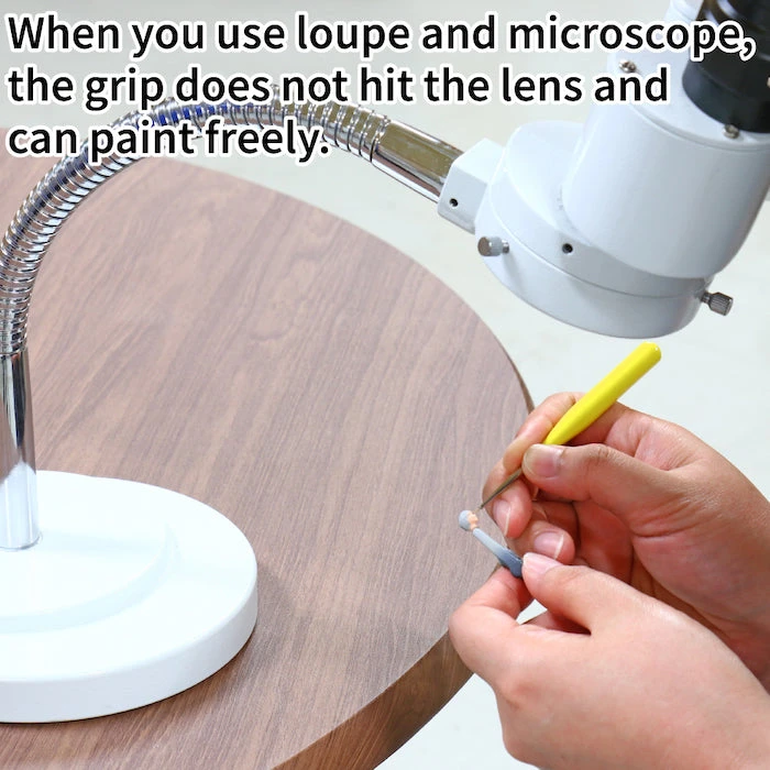 Shorter grip is easy to handle and you can find the best way to hold it intuitively.Make painting more fun.Shorter grip than other Brushwork series.Can hold it in your palm.Shorter grip is easy to handle and you can find the best way to hold it intuitively.Easy to paint by putting tip into tiny dent spot and lying the tip down.Strong against solvents and smooth painting with delicate artificial hair tip!When you use loupe and microscope, the grip does not hit the lens and can paint freely.Make painting more fun!!Tip is hard to shake!!