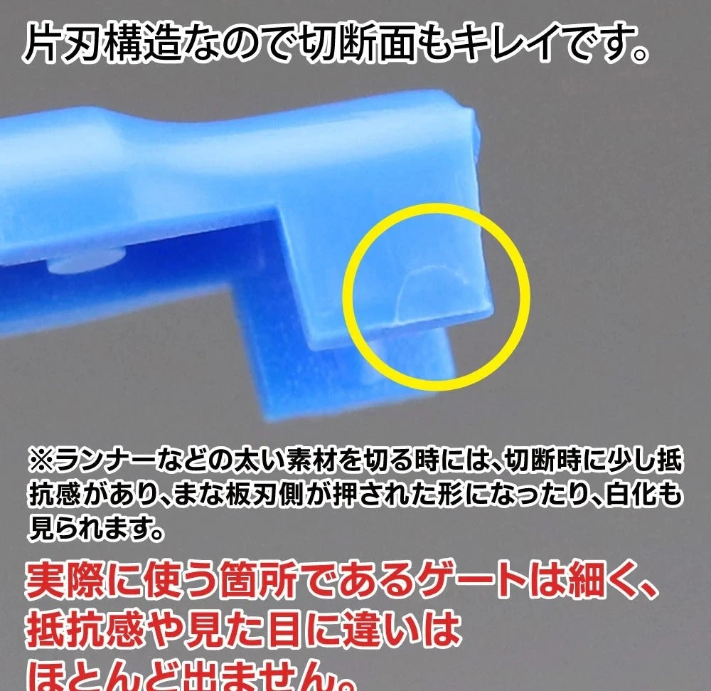 ・Single-edged structure allows for smooth cutting, and very small parts and plastic pieces are less likely to fly out when cutting.
