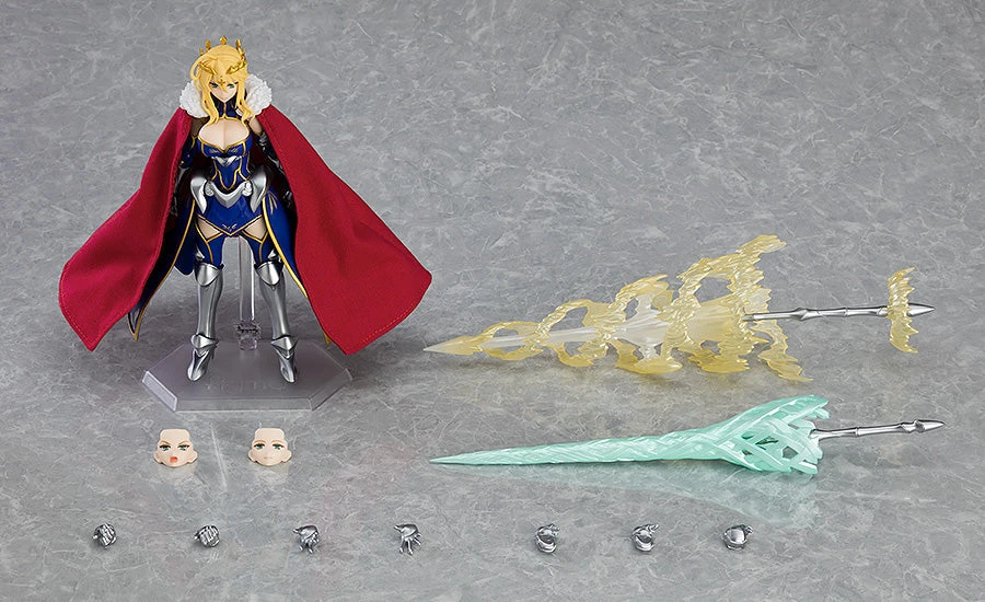 Her sacred spear Rhongomyniad is included as an optional part along with a version of Rhongomyniad as it appears when she unleashes her Noble Phantasm. Her cape features a wire in the hem allowing for easy posing. An articulated figma stand is included to display the figma in a variety of poses.