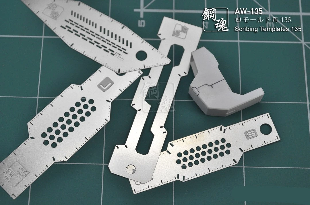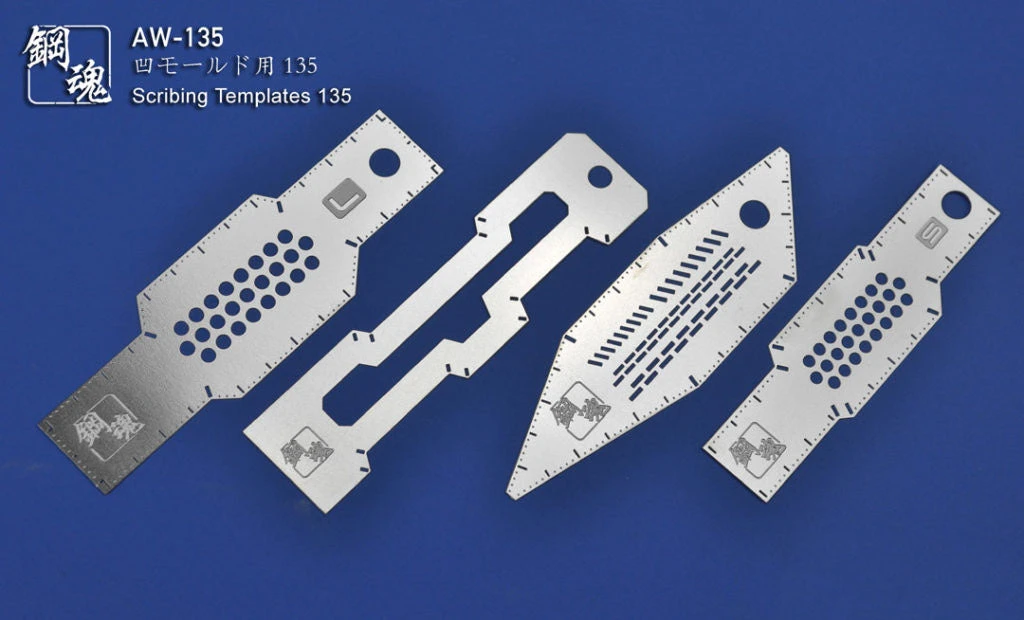 Scribing Templates are used to help guide your scribing and carving ‘machine style’ lines into your model kit. Use these templates to create designs and add additional details to the model’s surface.Â