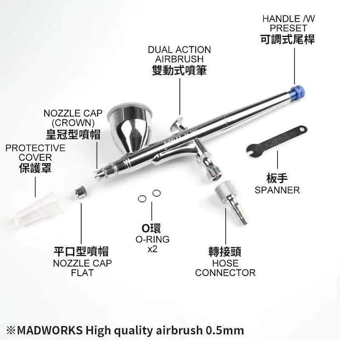 Madwork’s high quality airbrush is finally here in Canada Now. It is a 0.5mm double action airbrush with a chrome finish body. The capacity for the cup is 9ml.