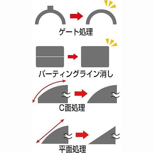 These items, similar to flexible stick-type files with a high degree of flexibility, are perfect for pinpoint cutting work such as gate processing and parting-line erasing!