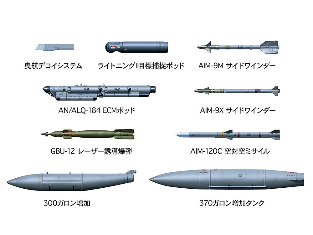 - AIM-120C and AIM-9M/X missiles, GBU-12 laser-guided bombs, LITENING II targeting pod, and external fuel tanks all included for a variety of weapons loadouts.