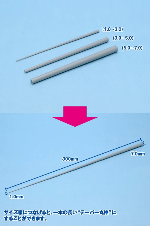 These tapered, cylindrical plastic rods can be used for detailing model kits. This package contains eight rods which are 100mm long each. These rods are 2mm on one end and taper to 4mm on the other end.